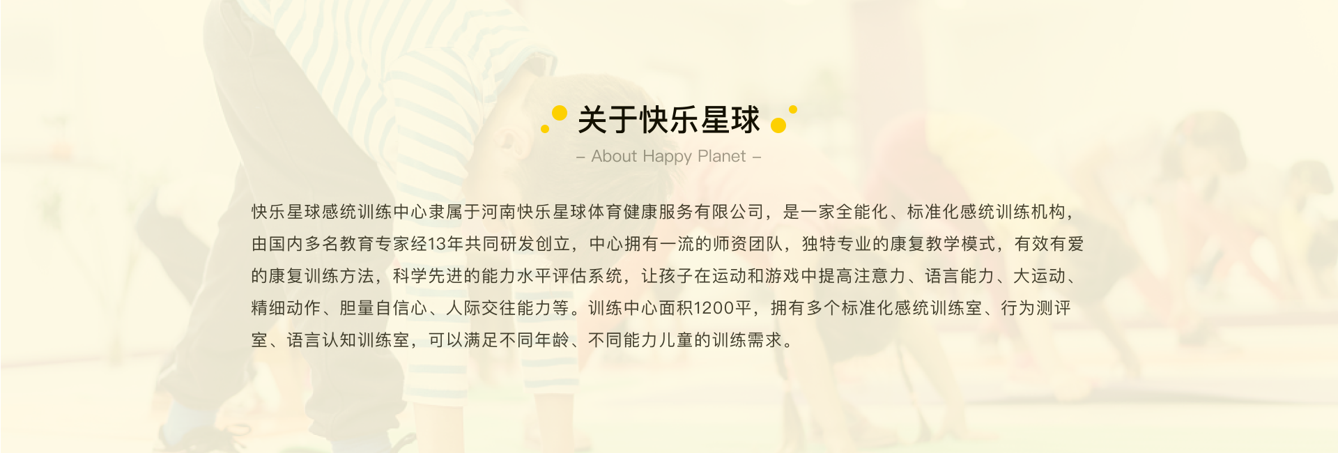 快乐星球始终以专业技术为指导,坚持技术引进和自主研发相结合,以儿童实际情况为基础,将先进理念和技术应用于实际教学当中,一生一案,同时自主研发感统测评系统,吸收引进引进台湾DLCI语言训练方法,值得您信赖与选择